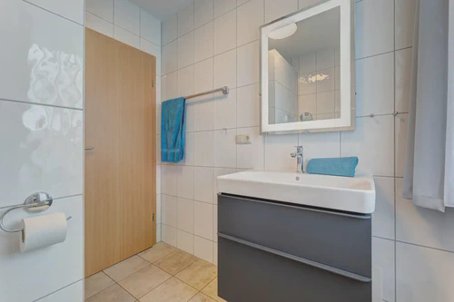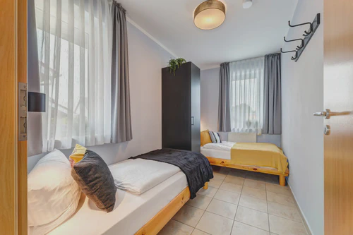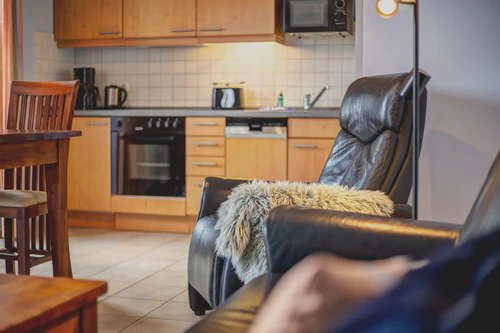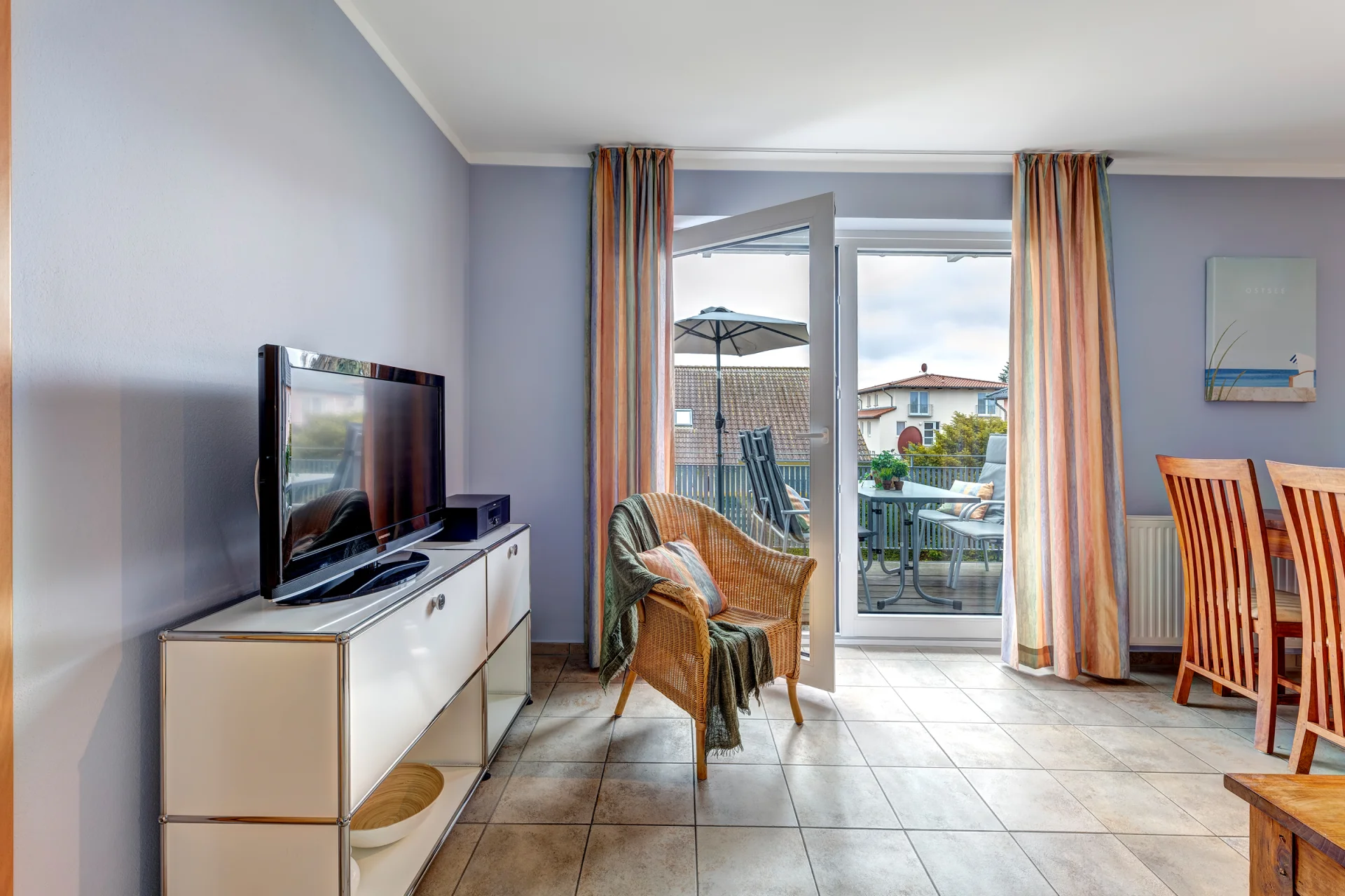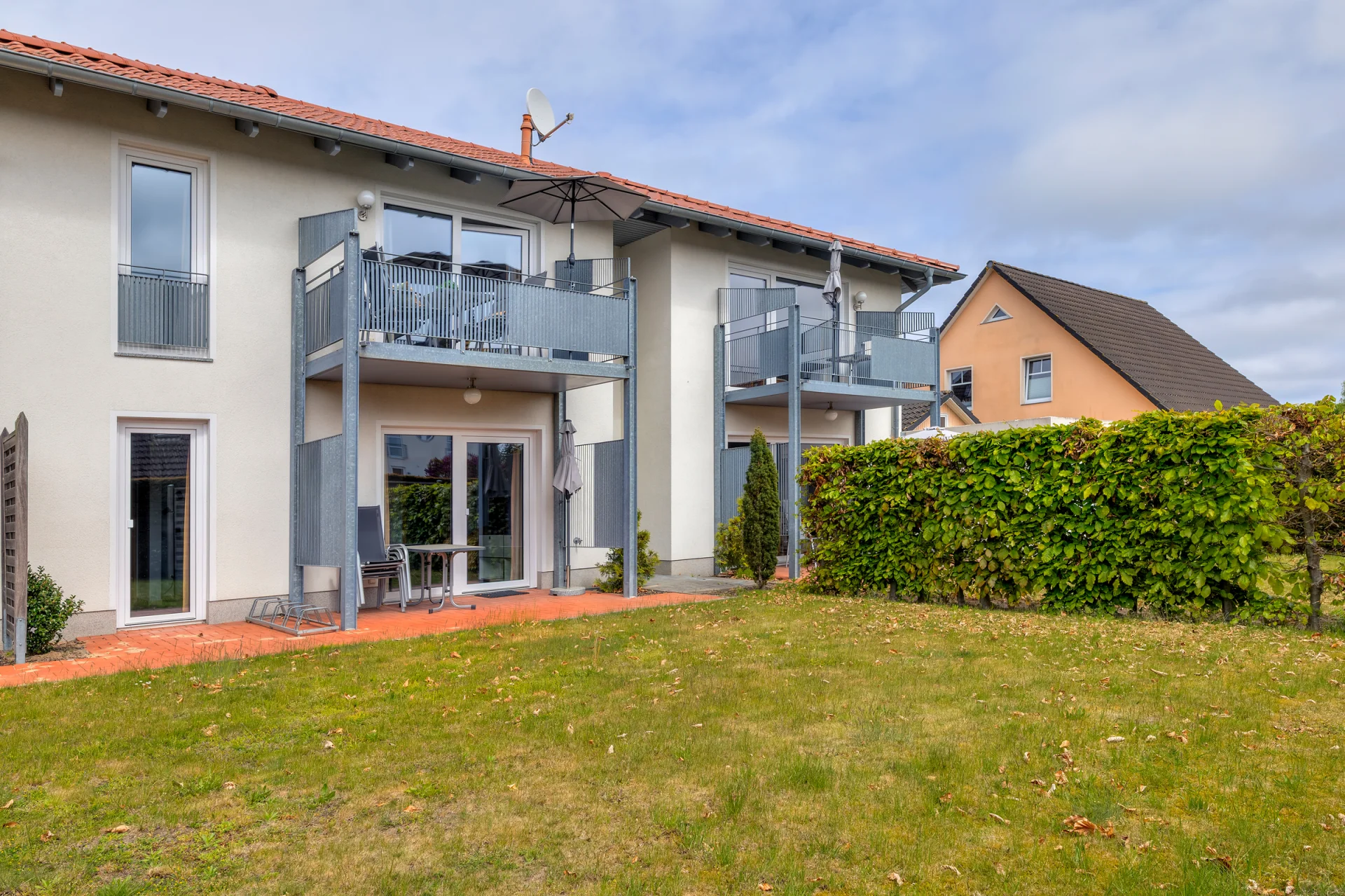 Die Wohnung verfügt über einen Wohnraum, zwei Schlafzimmer und ein Badezimmer. In dem geräumigen Wohnraum befindet sich eine voll ausgestattete Küche mit Essecke und Sofabereich. Die Schlafzimmer verfügen über ein Doppelbett sowie zwei Einzelbetten. Auch eine große Terasse mit Rasenfläche gehört zur Wohnung.
