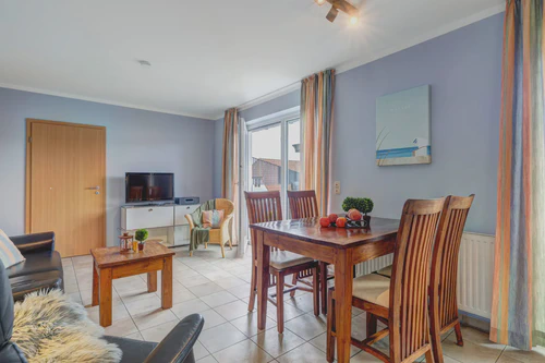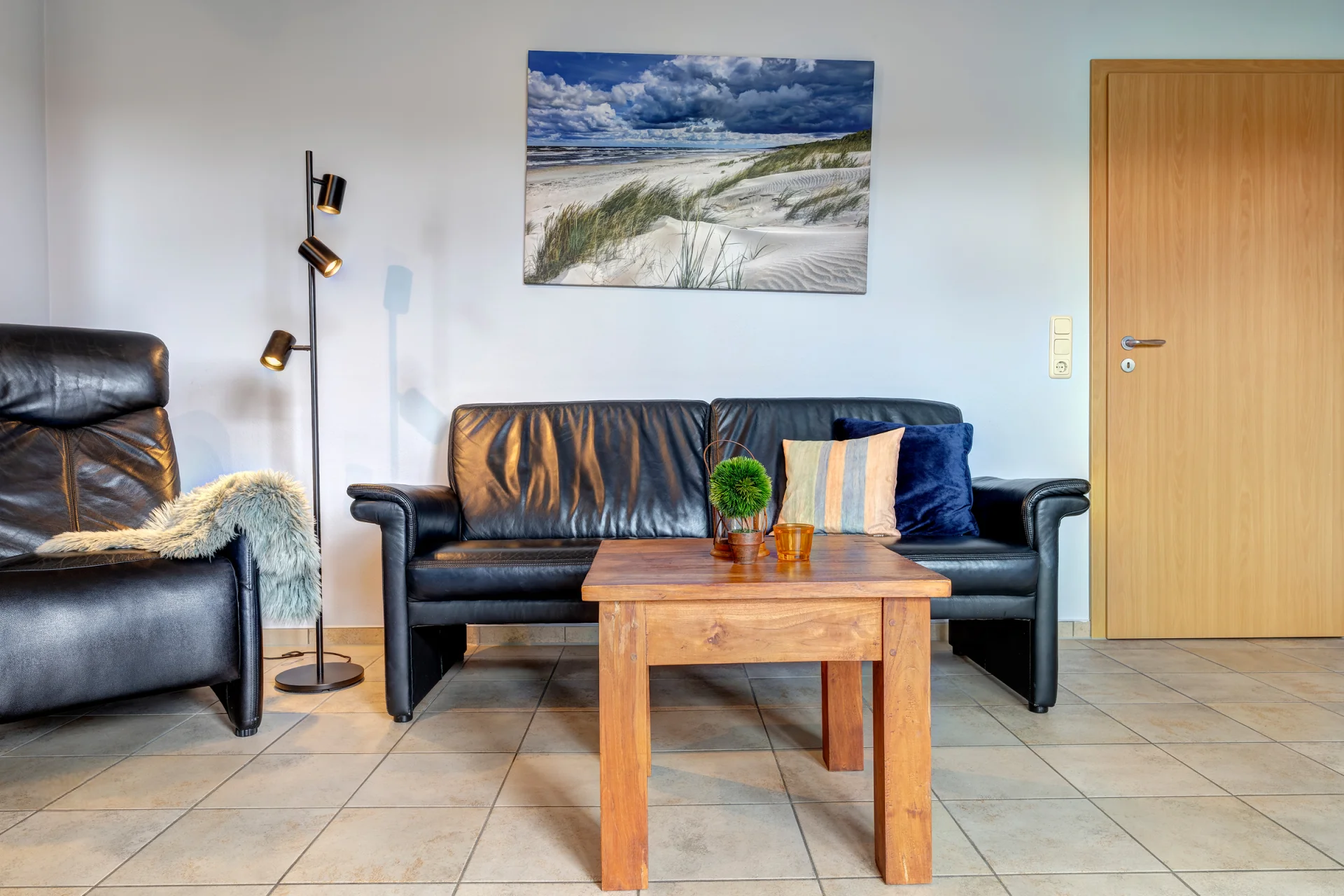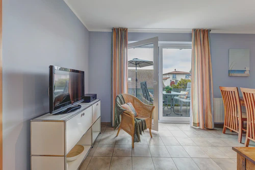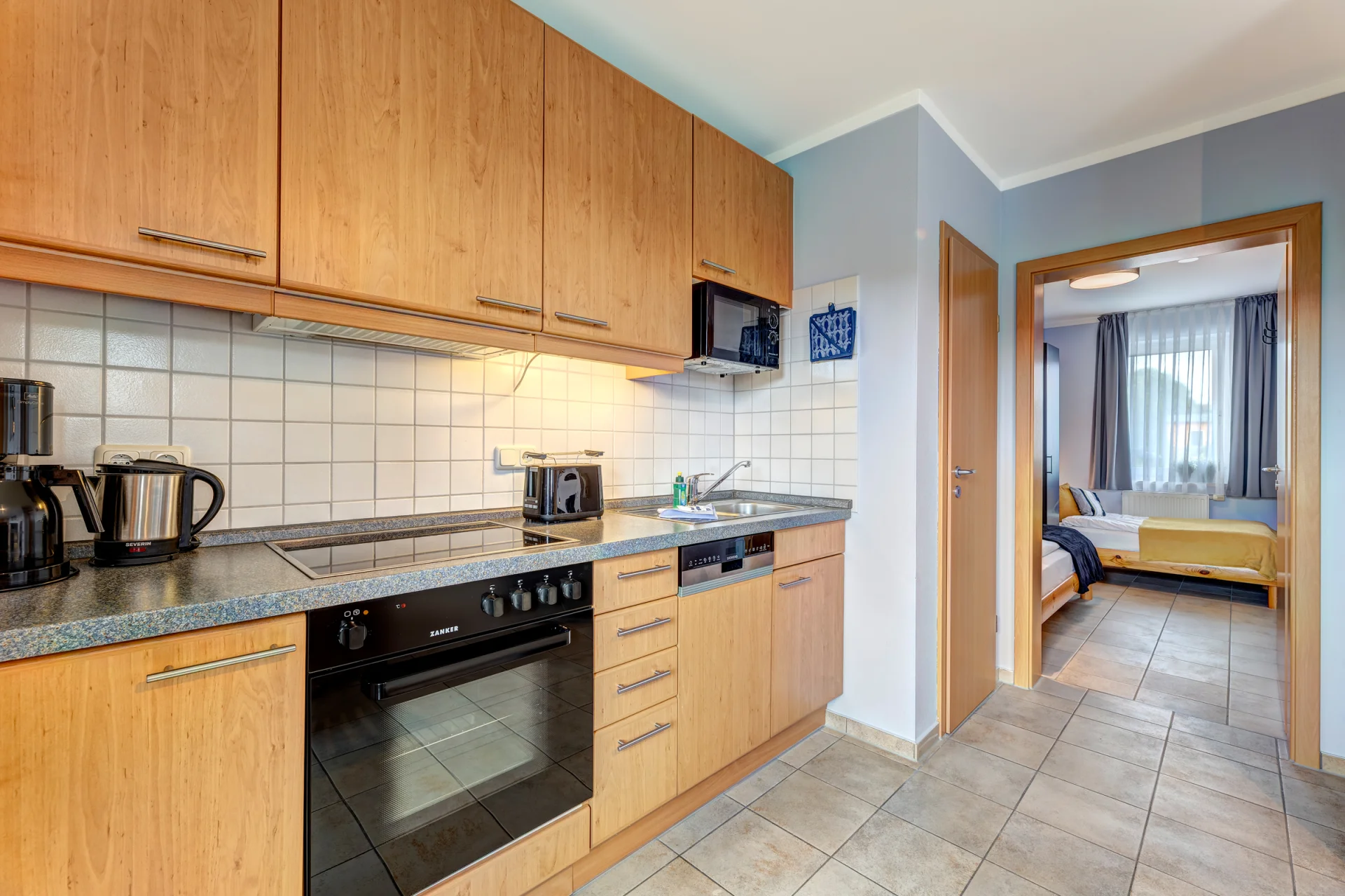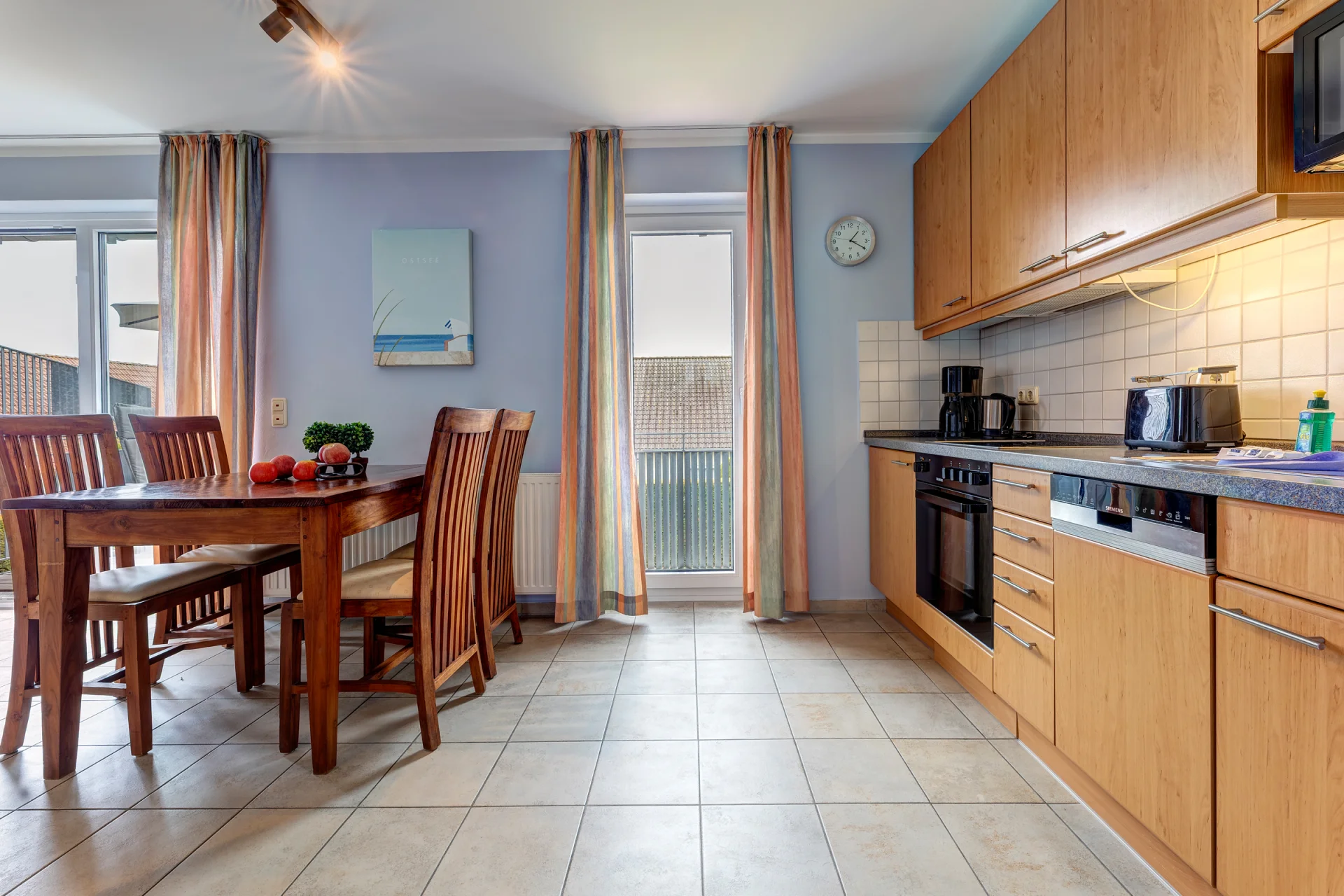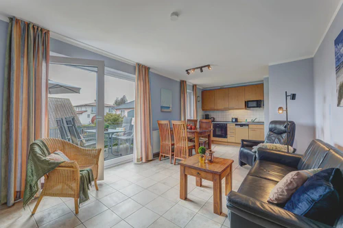 Die Wohnung verfügt über einen Wohnraum, zwei Schlafzimmer und ein Badezimmer. In dem geräumigen Wohnraum befindet sich eine voll ausgestattete Küche mit Essecke und Sofabereich. Die Schlafzimmer verfügen über ein Doppelbett sowie zwei Einzelbetten. Auch ein großer Balkon mit Sitzmöglichkeiten gehört zur Wohnung.
